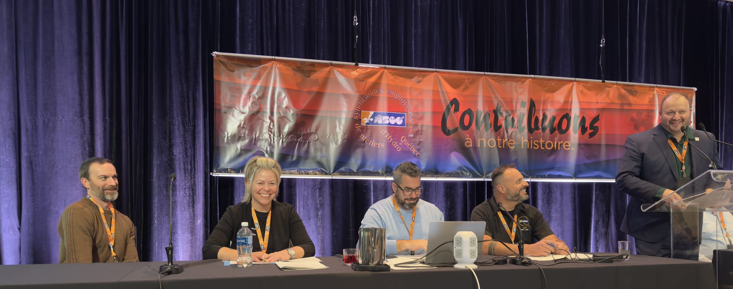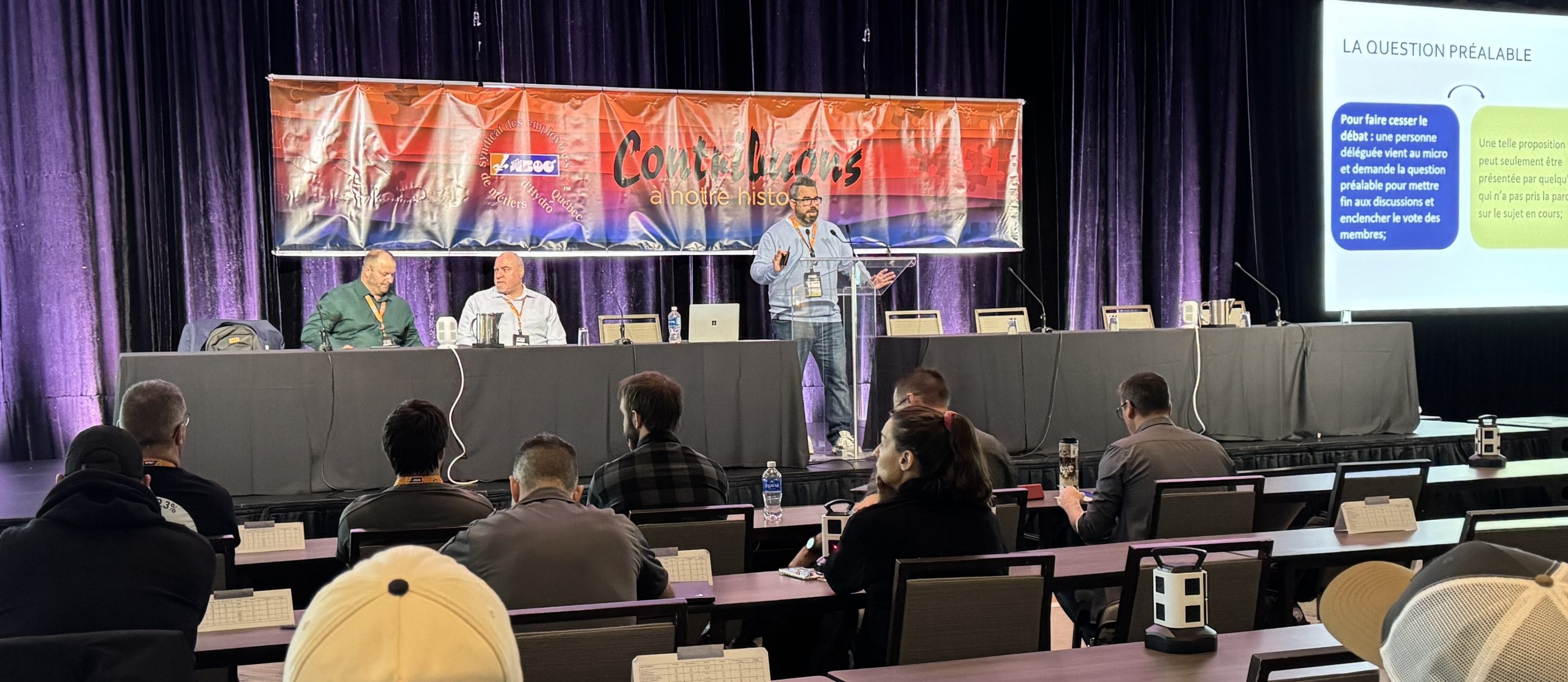 Avant l’ouverture du congrès, les nouvelles personnes délégué-es furent accueillies par les officiers provinciaux et le conseiller syndical provincial afin de connaître et apprendre sur le fonctionnement général d’un congrès et un survol des règles de procédure.